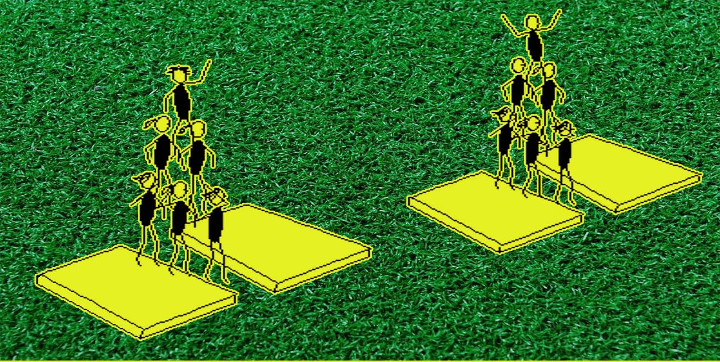 El juego consiste en pasar el balón al campo contrario con un maximo de tres toques por equipo y un bote en el propio campo.